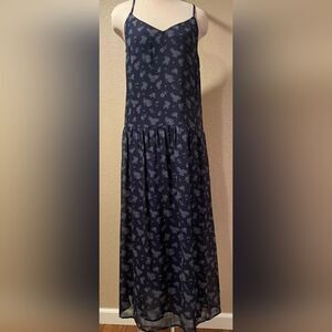 VINCE SP Coastal Navy Blue Calico Floral Print 100% SILK Spagetti Straps Lined Slip Midi Dress