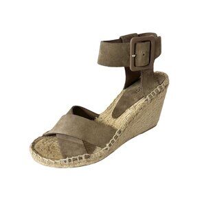 Effortless beachy style meets urban polish in this espadrille-inspired wedge sandal. Rich Italian suede upper and leather lining. Criss-cross straps across open toe. Looped adjustable ankle strap with covered buckle. Jute platform measures 3/4" and wedge heel measures 3 1/4". Rubber outsole.