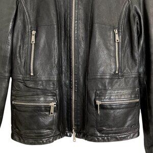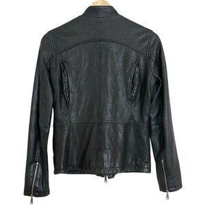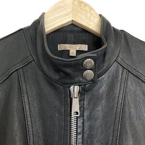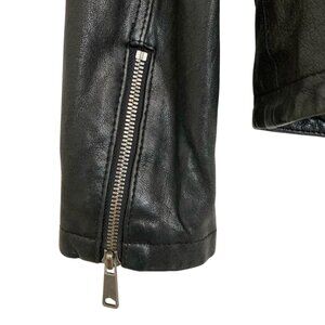 Crafted from supple, genuine sheep leather, this VINCE moto jacket in black is the epitome of effortless cool. Featuring a center front zip closure, zippered pockets, and zippered cuffs, it's a timeless classic with a modern edge. The sleek silhouette and luxe feel make it a versatile statement piece for any wardrobe! Perfect for dressing down with jeans or over a midi or maxi skirt or dress!