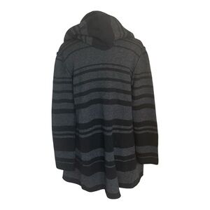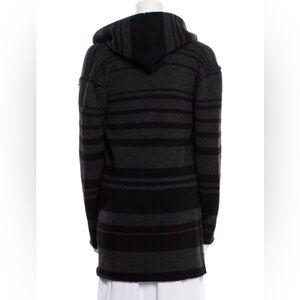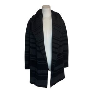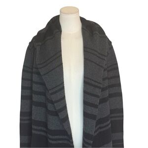 Stylish open cardigan with black and gray stripes. Perfect for layering. A quality wardrobe staple. Has side pockets. Hood. Relaxed fit. Excellent, gently loved condition. Only minimal piling, could easily be removed with fabric shaver. Really great piece!