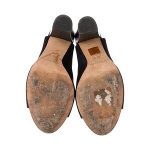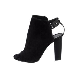 Featuring an open toe, open back, a suede finish, an adjustable ankle strap with buckle closure, and a block high heel. Peep-toe. Ankle strap with buckle fastening. Slip-on style. Material: 100% suede upper, leather lining and sole. Heel height: approximately 3.5". Fits true to size
