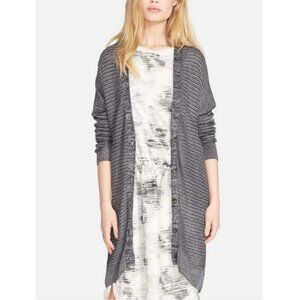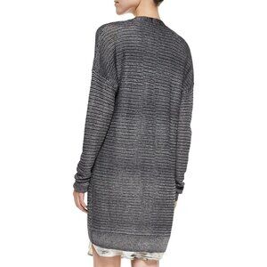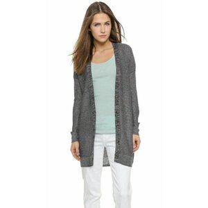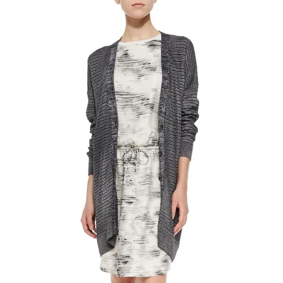 Vince metallic knit button front cardigan. Marled and solid strands compose the slinky, textured material of this cardigan. Tortoiseshell buttons close the placket. Dropped shoulder seams. Longline.