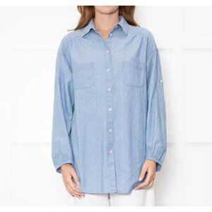 Vince size small blue denim button-up shirt with long sleeves and a pocket. It features a collared neckline, button closure, and a relaxed fit, making it suitable for various occasions such as travel, casual outings, workwear, and business meetings. The lightweight and machine washable fabric is made of 100% cotton denim, making it ideal for the summer, fall, and spring seasons. This minimalist Normie shirt, with a solid pattern and roll tab sleeves, embodies a classic yet trendy designer look, perfect for those who appreciate a 90s-inspired style.