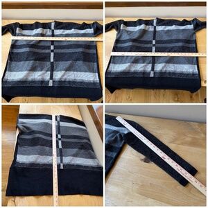 Size Medium, black and gray stripes, open front, hip length, pockets, long sleeves, wool and cashmere blend.