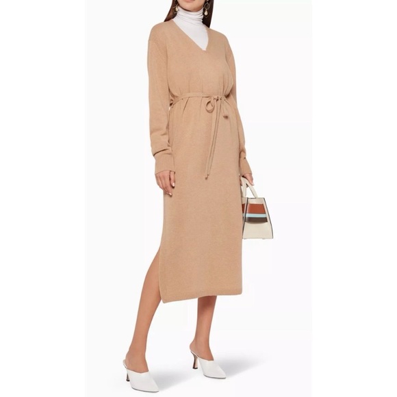 Vince Wool and Cashmere Blend Long Sleeve Midi Belted Sweater Dress. Super Soft and Cozy Knit. V Neck Style. Camel / Tan Color. Perfect Style for Fall. Excellent Condition. No Flaws. Size Medium