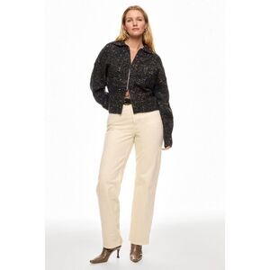 The Vince Wool Silk Donegal Zip Jacket offers a blend of luxury and comfort. Made from a rich combination of wool and silk, this jacket features a classic silhouette complemented by a subtle Donegal pattern, adding texture and depth to its black hue. The zip front closure and discreet side pockets provide both functionality and understated style.