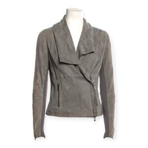 Drape Paper Weight Suede Biker Jacket in Grey. Features long sleeves, draped waterfall front, side zipper pockets, asymmetrical front partial zipper closure, cropped length, stretch ribbed side inserts. Genuine leather.