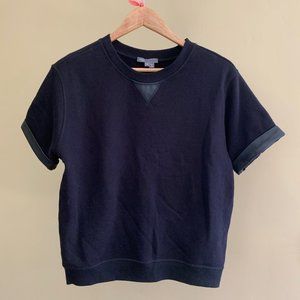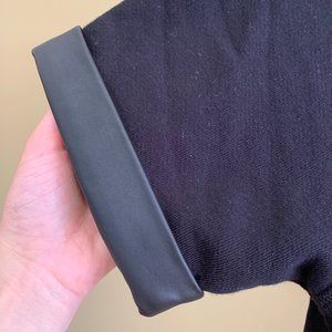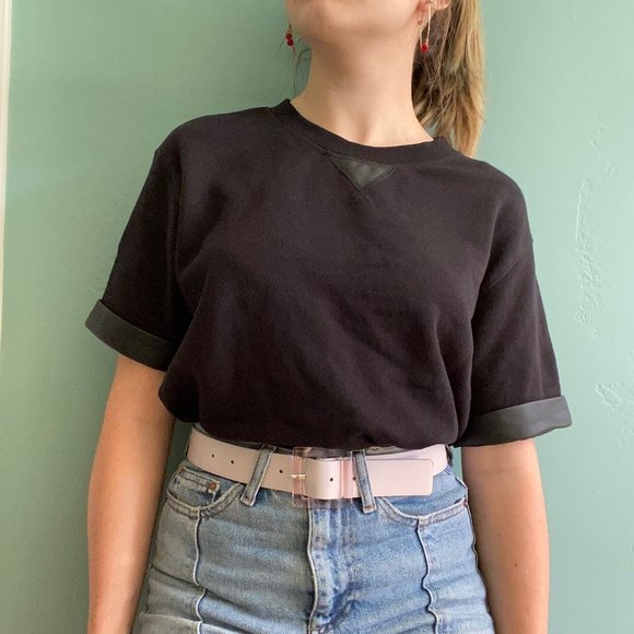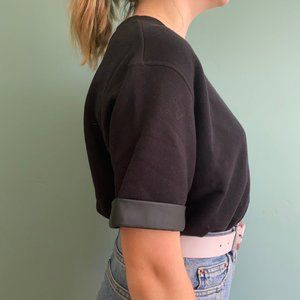 - Short-sleeve black crew-neck top - Only worn once! - Sweatshirt material with faux leather arm cuffs