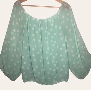 green top wth white polka dot design. 3/4 sleeves and elastic at cuffs and waist. Blouse is lined, Sleeves are sheer, Armpit to armpit: 20.5”, Length: 22” Size S