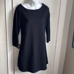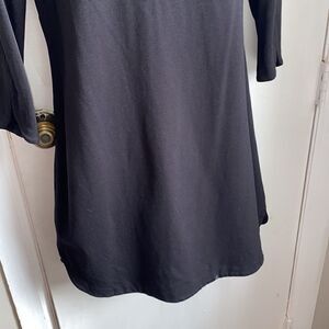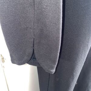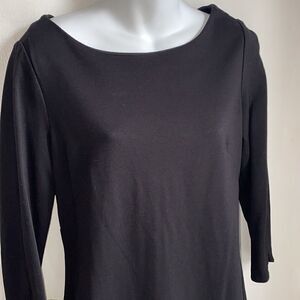 Rayon, nylon, spandex blend for a sturdy Ponte feel, curved detail at sleeves and hem, darts at breasts for a little bit of structure, dry clean, excellent condition. Size 6, measures 18” from armpit to armpit, 16” across the waist and 33” long from top of shoulder to bottom hem.