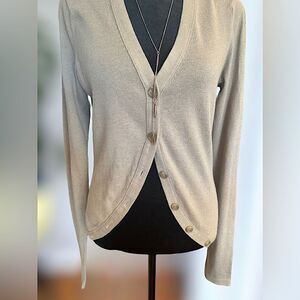 VINCE Round Hem Asymmetric Button Up Cashmere Cotton Cardigan. V neckline. Curved asymmetrical button front. Long sleeves. Lightweight Cashmere and Cotton.