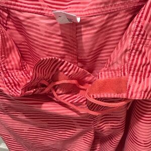 Vineyard Vines men’s red and pink striped shark print board shorts. Size 33. Double stick fly closure. Tie string at waist. One zip pocket on side. Swimming Surfing Fishing Boating Camping