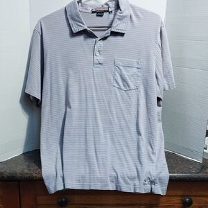 Stylish men's gray striped shirt, perfect for casual outings. It is in great condition and perfect for that "preppy look". The pocket is an extra bit of helpfulness! This shirt is cool with its whale logo that everyone will recognize.