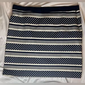 Vineyard Vines Fairway women’s skirt in navy blue and cream. Polka dots and stripes alternate. Fully lined.