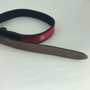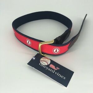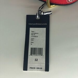 Vineyard Vines Men’s Los Angeles Angels MLB Baseball Leather and Canvas Belt. New with tags. Size 32 waist. 100% Cotton Canvas, 100% Nickle buckle, 100% imported silk webbing, and 100% Italian Bridle leather. Five notches for hole adjustment.