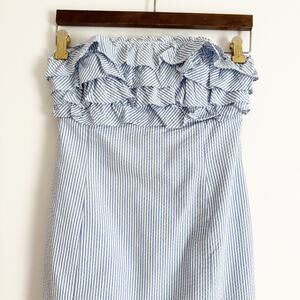 Blue and white striped seersucker strapless mini dress by Vineyard Vines.