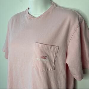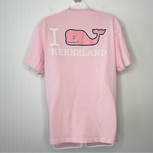 Light pink short sleeve crew neck T-shirt with pocket on front. Pocket says “Vineyard Vines Keeneland.” Back of T-shirt says “I Whale logo Keeneland.”