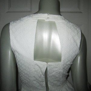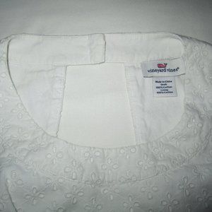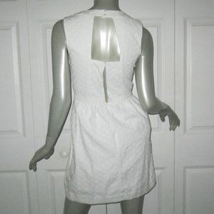 This sleeveless white dress from Vineyard Vines features a beautiful eyelet pattern. It has a scoop neck with a cut-out back and two buttons at the neck. Above-the-knee length - side pockets - fully lined. Note that the mannequin size is quite small so the zipper does not close all the way. However, the zipper definitely works! This dress is in excellent, gently worn condition.
