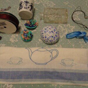 VINTAGE TEAPOT TEATOWEL CUP SWEET BOTTLE HAT EARINGS NECKLACES PINCUSHIN RIBBON LOT.  THIS IS SUCH A DARLING LOT.  WE DO NOT BREAK UP LOTS NOR BUNDLES.   MOST ITEMS ARE VINTAGE THOUGH NOT ALL.  MOST ITEMS HAVE WEAR THOUGH NOT ALL AND SOME MORE THAN OTHERS. OF NOTE: TEATOWEL 25 & 1/2 INCHES BY 17 INCHES.  HAND PIN CUSHIN MORE NEWISH.  OLD BOTTLE WITH TEXTURES AND SHAPES MORE FEMME.  BLUE RIBBON.  NEWISH CHRISTMAS RIBBON. 2 NECKLACES ONE OF THEM ON CLOTHE OR SUEDE. COUNTRY FOLK CUP.  HANDMADE 80S 90S CRAFTY HAT EARINGS.  ENJOY THE GOODIES.  VINTAGE TEAPOT TEATOWEL CUP SWEET BOTTLE HAT EARINGS NECKLACES  PINCUSHIN RIBBON LOT.  4TH GROUP.  # 83.  THANKS