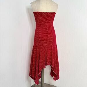 Vintage Y2K Polka Dot Midi Dress Red White Ruched Coquette Asymmetrical / Handkerchief Hem, Size Medium, Lined, Pin Up Retro