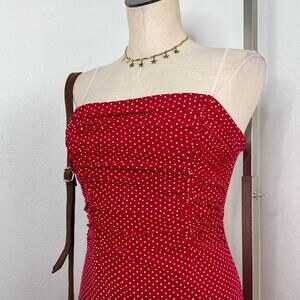 VINT Y2K Polka Dot Midi Dress Red White Ruched Coquette Asymmetrical Hem Medium