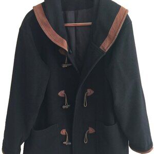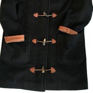 VINTAGE 100% WOOL LEATHER TRIM HOODED DUFFLE COAT WOMENS 10 BLACK MADE IN USA