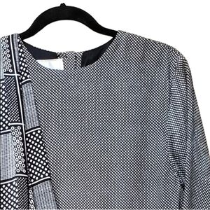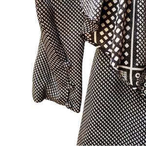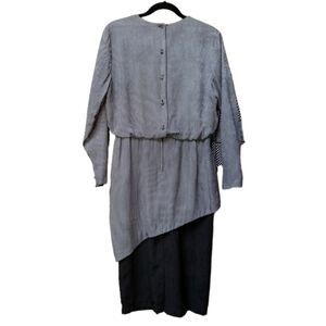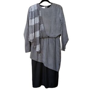 Vintage Junnie Leigh dress. 100% pure silk. Long sleeve. Full button back. Beautiful scarf detail. Elastic waist. Gorgeous mixed patterns! A head Turner. Perfect for a vintage Christmas photo or event!