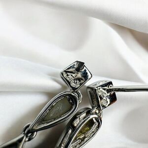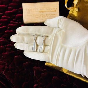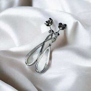 Vintage 10K White Gold Pear Cut Bezel Set Natural Mother of Pearl and Diamond Accent Dangle Earrings. These gorgeous earrings are crafted from 10K White gold, hallmarked 10K. Featuring 4 genuine pear cut cabochon mother of pearl shell stones and 2 diamond accents, bezel and prong set Retro styling and quality gold-work and polished to a mirror like finish. The expertly set shiny cream white stones are polished, faceted and exhibits a beautiful metallic colour. The gems are set in a housing of solid white gold. They are dangle style earrings, which hang gracefully and measure 34x8mm. The earrings are for pierced ears, featuring solid 10k white gold push backs. These vintage era earrings look stunning when worn, truly a versatile and beautiful gift , or wonderful addition to any jewelry collection. Weigh 3.5g. Very Classy Jewelry!