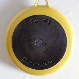 Vintage, pre-owned, Colorcast brand, made in Waterford Ireland, yellow enamel, cast iron skillet pan. Features a wood handle. (See photos for details) I am the original owner. It has been in climate controlled storage for decades. Comes from a pet and smoke free home.