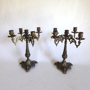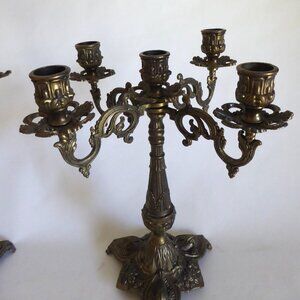 Vintage, gothic, decorative, brass candelabra set. They each hold 5 tapered candles. They have movable arms so they do not take up as much room when stored. They were purposely not cleaned as to keep its antique integrity. (See photos for details) I am the original owner. It has been in climate controlled storage for decades. Comes from a pet and some free home.