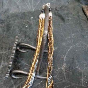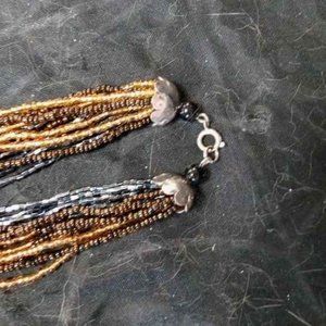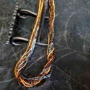 THIS IS A VINTAGE GLASS SEED BEAD CHOKER STYLE TWISTED NECKLACE. IT CONSISTS OF 12 STRANDS WITH YELLOW, BLUE, BURGANDY SEED BEADS. IT WAS MADE PROBABLY IN THE 1950S. THESE NECKLACE WERE WORN FROM THE 1940S UNTIL CURRENT...THESE WERE USUALLY HAND MADE AND THEY ARE AN ART FORM IN THEMSELVES AS NO TWO ARE ALIKE FROM THE COLORS CHOSEN. THIS IS A COMPLIMENTS TO WHOMEVER WOULD BE WEARING IT. THIS IS AN UNSIGNED PIECE OF FINE COSTUME JEWELRY. THESE BEADS WOULD BE DELICATE TO WORK WITH BEING THAT THEY ARE SO SMALL.