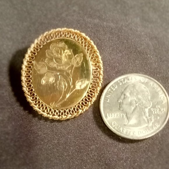 SIGNED "WINARD 1/20 12K GF", VINTAGE GOLD FILLED BROOCH/PIN WITH FILIGREE EDGE WITH AN ETCHED DESIGN IN THE CENTER OF OF A ROSE WITH BRANCHES AND STEM. HAS A SAFETY CATCH SO YOU WON'T LOSE IT. THIS BROOCH MEASURES APPX. 1.25" x 1 1/8". IT IS IN LOVELY VINTAGE CONDITION. CAME FROM GREAT GRANDMA'S JEWELRY BOX.