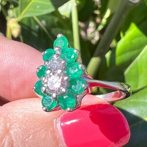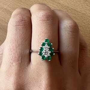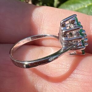 GORGEOUS RING IN SOLID 14K WHITE GOLD ( STAMPED AND ALSO TESTED) WITH DIAMONDS AND VIBRANT COLOR EMERALD HALO , CREATING A PEAR SHAPE LOOK. I DO NOT HAVE CARAT WEIGHT, ALL STONES HAVE BEEN TESTED. THE LARGER DIAMOND, MEASURED INSIDE THE SETTING ONLY , IS APPROXIMATELY 3.9MM IN SIZE , WHILE THE SMALLER DIAMOND IS APPROXIMATELY 2.6MM IN SIZE. THE WHOLE RING “FACE” IS APPROXIMATELY 12MM LONG BY APPROXIMATELY 8.7 MM WIDE AT THE WIDEST PART.