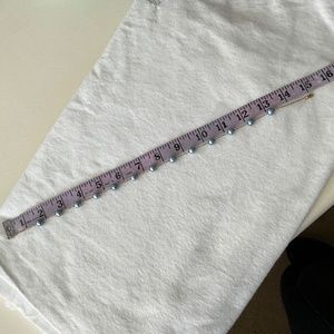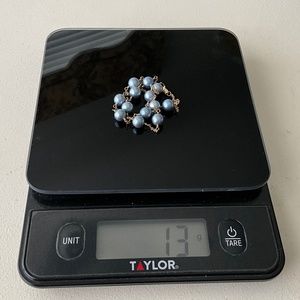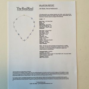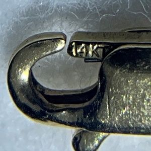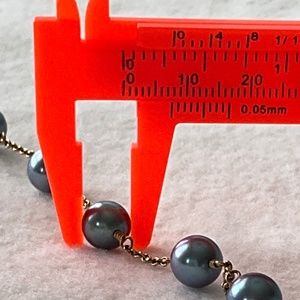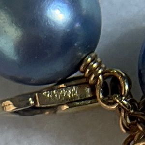 A gorgeous, unique find that you don’t see every day in excellent pre-loved condition. Vintage tin cup necklace with blue cultured pearls on 14k yellow gold chain. The pearls are approximately 8 mm. and medium light blue in color. My camera tends to darken colors, but the true color is best seen in the photo with the scale. Please realize that colors may appear differently depending on your monitor. Necklace is approximately 15” long. An extension chain could be added if you prefer a longer length. No significant flaws detected. As this is a vintage piece, there may be light scratches under magnification that are not visible in photos. Some of the pearls have small spots/depressions, really only noticeable on close inspection under magnification. I originally consigned this with TRR in 2017 but requested that it be returned to me shortly thereafter. I have included their valuation of the necklace (from 2017, value has likely increased since then) in the photos to provide additional details. Measurements and hallmarks in photos. I wasn’t able to clearly capture what appears to be a hallmark on clasp, but included the photo of it anyway. Comes with black velvet-like drawstring pouch as pictured.