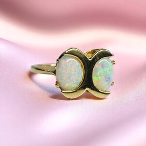 A beautiful Vintage Natural Australian Opal White Opal Boulder Opal Cabochon Double Crescent Moon Ring! This alluring 14kt gold vintage ring holds 2 oval cabochon natural opals, 7.5x5mm along a timeless double crescent moon setting. The stones are simply mesmerizing, displaying an array of iridescent colors that flash and shimmer! A variety of colorful shades are included in the color play, almost seeming to glow from within. A simply exquisite vintage ring, it is perfect for any opal lover! Gypsy Ring, Witch Ring, Pagan Ring, Priestess Ring, New Moon Double Moon Half Moon Ring