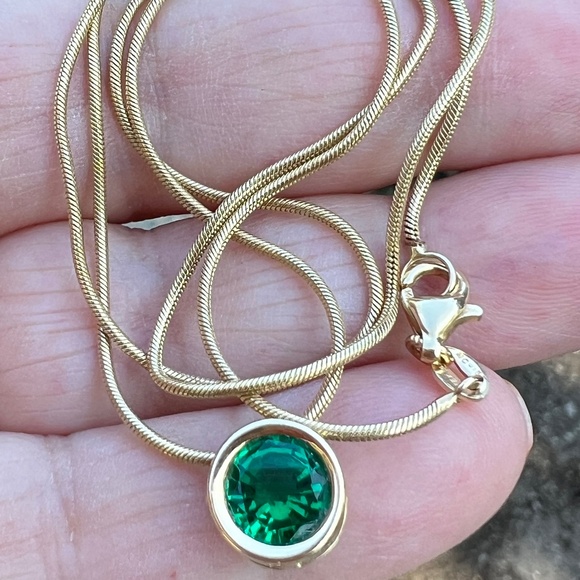 WITH A BEAUTIFUL SATURATED LUSH GREEN COLOR BEZEL SET LAB CREATED EMERALD ON A SLEEK SNAKE CHAIN WITH LOBSTER LOCK.
