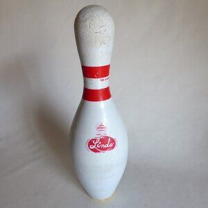 Vintage, bowling alley used, Linds brand, USBC approved, regulation, white with red stripes, plastic bowling pin. Reads: “Control weight, Approved plastic coated, PAT. #5833547”.