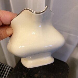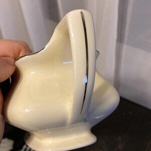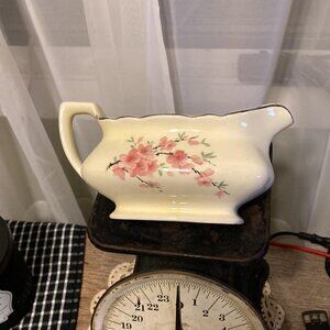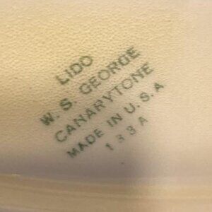 This gravy boat is 7" x 4" and the outside has pink blossoms on it and a golden trim around the edge. It is in very good condition for it's age. I do not notice crazing on it but some discoloration, which is normal for a piece this old. On the bottom are the words "LIDO (refers to the shape of the ware) W . S. GEORGE CANARYTONE MADE IN USA 133A (although could be 183 A) Please view photos to see details and to confirm condition.