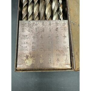 This is a vintage metal storage box designed to hold drill bits from the 1930s. The box is marked with the Huot brand and has a green color. It is suitable for storing and organizing drill bits, and is made of durable metal. The box does not come with any drill bits, but it is a great addition to any tool collection. The model number is HUOT 1930617 and it was manufactured in the United States. Only 16 bits included. Great vintage item!!