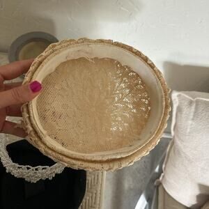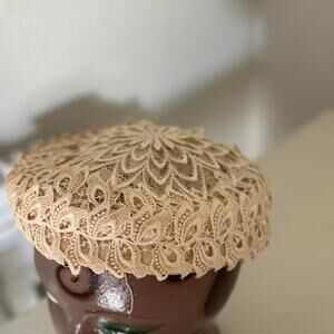 Charming mid-century pillbox hat featuring intricate beige lace in a floral motif. Lightweight and elegant — ideal for vintage-inspired outfits, church attire, or wedding guest styling. A timeless piece of 1950s millinery craftsmanship.