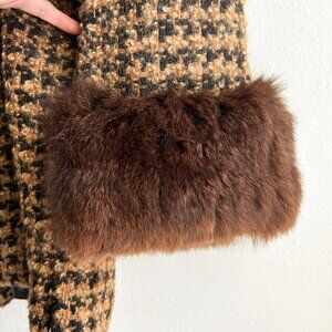 beautifully woven wool tweed in warm camel and black tones, it features ultra-soft, luxurious genuine fur cuffs that add elegance and sophistication. The fur is plush and fine-textured, likely rabbit or a similar natural fur, providing both warmth and a refined look.