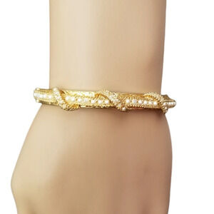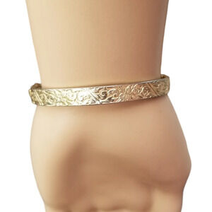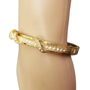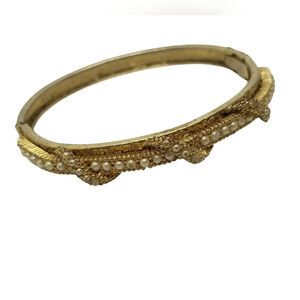 Lovely vintage goldtoned bracelet circa. 1950s has ornate design and tiny faux pearl detail. Bracelet opens on a hinge and is in good condition but some of the tiny faux pearls have lost their white coating due to age, this can be seen in close up pics. Bracelet measures 7 inches around inside and 1/4 inch tall.