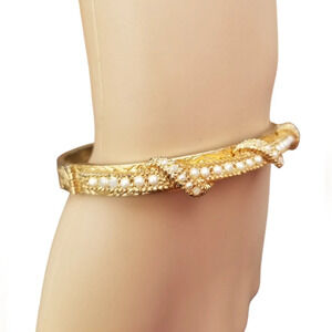 VINTAGE 1950s ORNATE GOLDTONE & FAUX PEARL HINGED BRACELET
