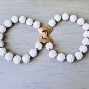 This exquisite vintage estate bracelet, signed by Monet and dating back to the 1960s, is a stunning testament to timeless elegance and craftsmanship. The double-strand design showcases meticulously carved white floral beads, adding a touch of sophistication and texture. Each bead is accented with delicate golden spacers, enhancing the bracelet's luxurious appeal.
