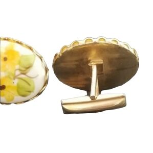 Beautiful pair of vintage lady's cufflinks featuring enamel portrait of handpainted yellow flowers on porcelain. Metal is goldplated steel. Cufflinks are 1 inch in length and 3/4 inch in width.