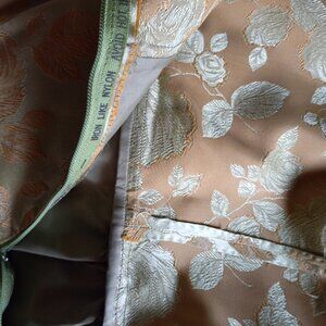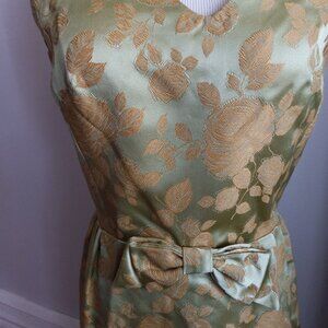 BEAUTIFUL 1960S VINTAGE SHEATH DRESS AND JACKET. THIS LOVELY DRESS ZIPS UP THE BACK AND IS EMBELLISHED WITH A BOW AT THE WAIST. GREEN AND GOLD FLORAL BROCADE FABRIC. HAS TABS WITH SNAPS FOR BRA STRAPS. NO LABELS AS IT APPEARS TO BE CUSTOM MADE (SOME HAND STITCHING ON JACKET) AND NEVER WORN. THE ZIPPER IS PLASTIC. BOTH DRESS AND JACKET ARE LINED. JACKET IS OPEN. I WOULD SAY THIS IS ABOUT A SIZE 6, BUT PLEASE SEE FOLLOWING MEASUREMENTS. NO FADING LAST FIVE PHOTOS WAS MY CAMERA. COLOR IS CLOSEST TO FIRST AND SECOND PHOTO.