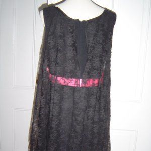 BLACK SHEATH DRESS (FEELS LIKE CREPE) WITH A LACE OVERLAY. IT HAS A METAL ZIPPER UP THE BACK AND A PINK BOW UNDER THE BUST. THE OVERLAY IS OPEN AT THE BACK. THIS DRESS IS LINED. NO LABEL. I WOULD SAY THIS IS PROBABLY A MEDIUM. PERFECT CONDITION!