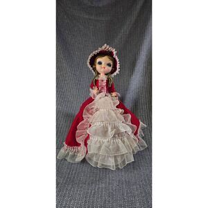 Add a touch of vintage charm to your collection with this VINTAGE 1960s Bradley Dolls Music Box Big Eyed Southern Belle Doll. This lovely piece features the classic big-eyed look so popular during the era, paired with a beautiful Southern Belle outfit and bonnet. Crafted with a paper mâché head and soft body, she sits gracefully atop a working wind-up music box that plays a sweet tune when activated.