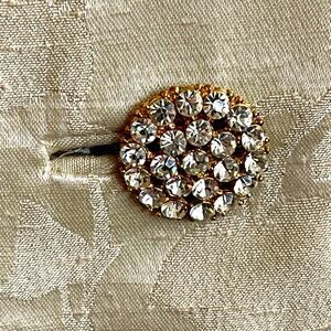 The double breasted cropped jacket in matching ivy brocade has a notched collar, double welt button holes with rhinestone buttons, and bracelet sleeves.