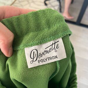 This is a gorgeous vintage set: comes with the polka dot blouse, green skirt, and green pants. The top is size M and the pants and skirt are size 12. Great condition but please note small stain on back side of one sleeve of blouse, as pictured. This is a rare find and collectible set!